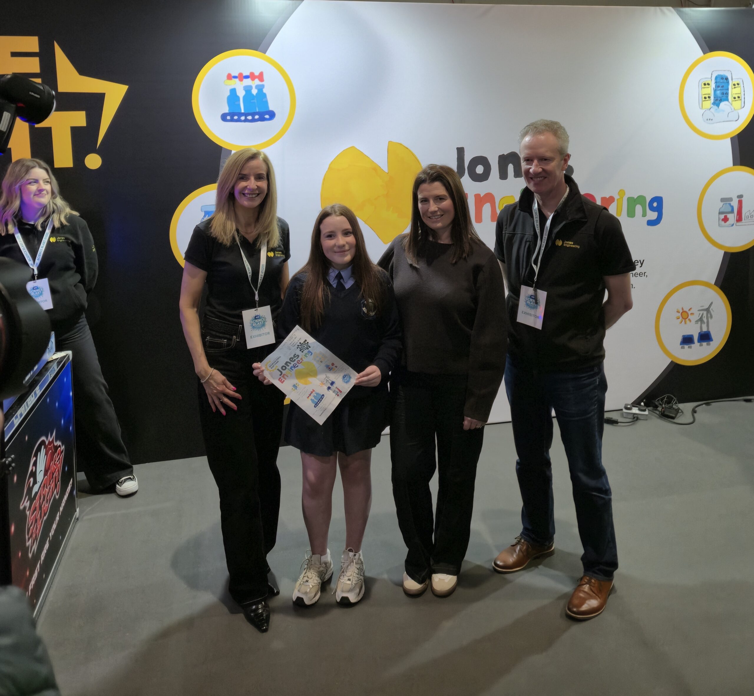 Prior to the event, we held a competition for the children of Jones employees, inviting them to submit their best piece of artwork that fit specific engineering related prompts. The winner’s artwork would then be the blueprint for the design of our Science Blast booth. After some very tough deliberation, Ciara, age 12, was the winner with an amazing illustration. Congratulations Ciara!